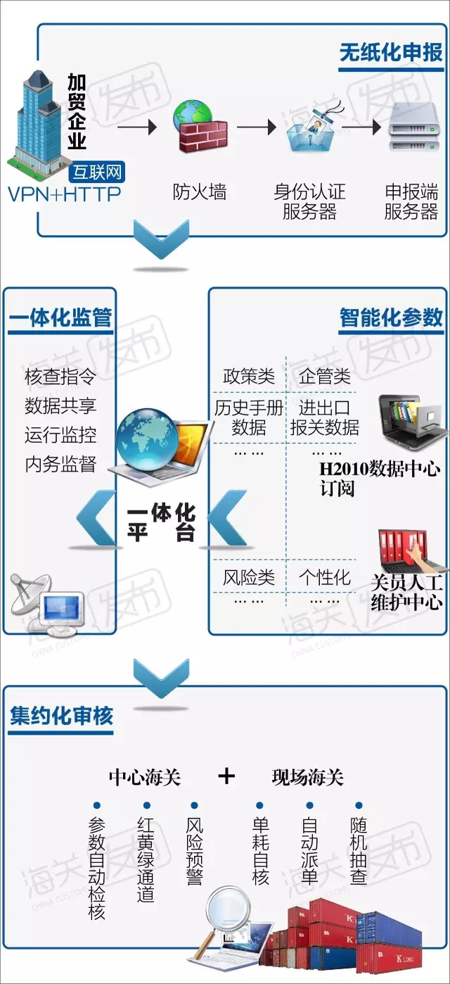 通過內(nèi)部的流程再造,以信息化手段實現(xiàn)加工貿(mào)易海關(guān)執(zhí)法作業(yè)的無紙化,以集中管理、專業(yè)審核實現(xiàn)集約化,以完善風(fēng)險參數(shù)實現(xiàn)運行監(jiān)控的智能化,通過信息互聯(lián)互通,相關(guān)部門廣泛參與、錯位監(jiān)管、協(xié)同施力,最終實現(xiàn)加工貿(mào)易監(jiān)管的一體化。