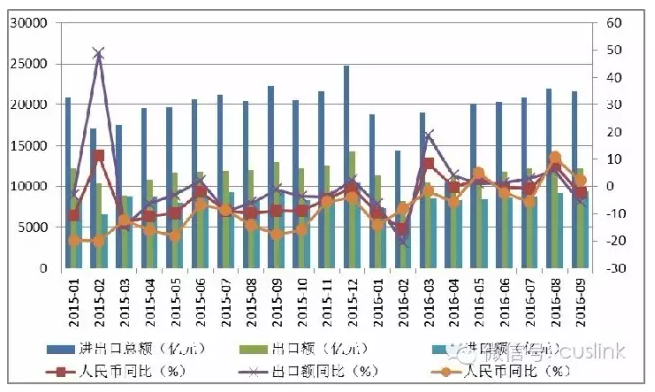 圖表 1 2015年1月-2016年9月我國進(jìn)出口貿(mào)易逐月情況對比